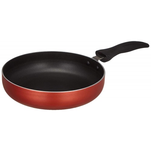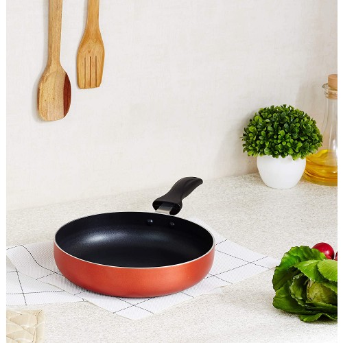 Prepare stir-fries, saute vegetables and more with the Non-Stick Fry Pan with 2-Way Non-Stick Coating. Made from 100% virgin aluminium this fry pan is durable and long lasting. A food grade 2-way non-stick coating lasts longer and offers a safe and healthy cooking surface requiring minimal use of oil. This fry pan is sturdily built with a thickness of 2.9 mm and weight of 578 gm. Non-Stick Fry Pan with 2-Way Non-Stick Coating comes in an attractive red metallic paint. Fitted with a cool touch bakelite handle, it provides a comfortable and firm grip. This fry pan is ideal for sauteing and shallow frying. It is easy to use and can be used on both gas and induction cooktops. For your convenience it is also dishwasher safe.