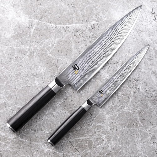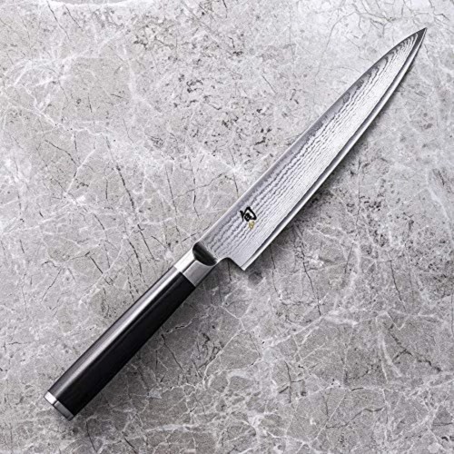 34 layers of stainless Damascus cladding each side (68 total) support the core, add stain resistance, and help food release from the blade